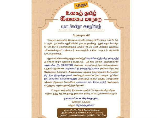 புதுச்சேரி: புதுச்சேரியில் பதின்மூன்றாவது உலகத் தமிழ் இணைய மாநாடு, வரும் செப்டம்பர் 19, 20, 21 (வெள்ளி, சனி, ஞாயிறு) ஆகிய மூன்று நாட்கள் நடைபெற உள்ளது.