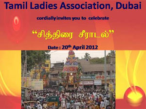 துபாய் தமிழ்ப் பெண்கள் சங்கத்தின் சித்திரை சீராடல் எனும் சிறப்பு நிகழ்ச்சி இன்று(20ம் தேதி) மாலை 6.30 மணிக்கு இந்தியா கிளப்பின் தர்பார் ஹாலில் நடைபெற இருப்பதாக சங்க தலைவி மீனாகுமாரி பத்மநாதன் தெரிவித்துள்ளார்.