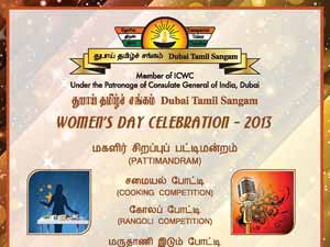 துபாய் தமிழ்ச் சங்கத்தின் மகளிர் தின கொண்டாட்டம் 22.03.2013 அன்று மாலை 4 மணிக்கு நடைபெற இருப்பதாக தமிழ்ச் சங்க தலைவி ஜெயந்தி மாலா சுரேஷ் தெரிவித்துள்ளார்.