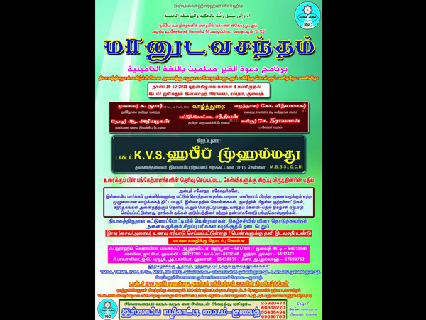 குவைத்தில் உள்ள ஜமியதுல் இஸ்லாஹ் அரங்கத்தில் வரும் அக்டோபர் மாதம் 16ம் தேதி மாலை மானுட வசந்தம் நிகழ்ச்சி நடைபெறுகிறது. இந்த நிகழ்ச்சியில் டாக்டர் கே.வி.எஸ். ஹபீப் முஹம்மது, துணை தலைவர் இஸ்லாமிய நிறுவனம் அறக்கட்டளை சென்னை அவர்கள் சிறப்புரை ஆற்றுகிறார்.