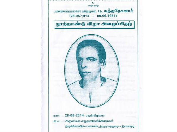 திருச்சிராப்பள்ளி மாவட்டம் திருத்தவத்துறை(இலால்குடி)யில் பண்ணாராய்ச்சி வித்தகர் குடந்தை ப. சுந்தரேசனார் நூற்றாண்டு விழா 28. 05. 2014 (புதன் கிழமை) காலை 9 மணி முதல் இரவு 8 மணி வரை நடைபெற உள்ளது.