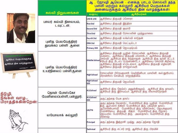 சென்னை: ஒன்இந்தியா தமிழ் வாசகர் ஆ. ஜோஷி ஆலன் நமக்கு ஒரு வித்தியாசமான ஆசிரியர் தின வாழ்த்தை அனுப்பியுள்ளார்.