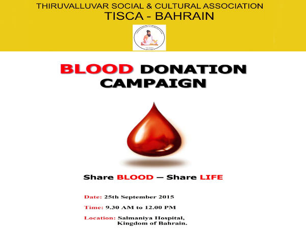 பஹ்ரைனில் செயல்பட்டு வரும் திருவள்ளுவர் சமுதாய மற்றும் கலாச்சார மன்றம் பல்வேறு சமூகநல பணிகளை செய்து வருகிறது. இந்நிலையில் அந்த மன்றம் ரத்ததான முகாம் ஒன்றுக்கு ஏற்பாடு செய்துள்ளது.