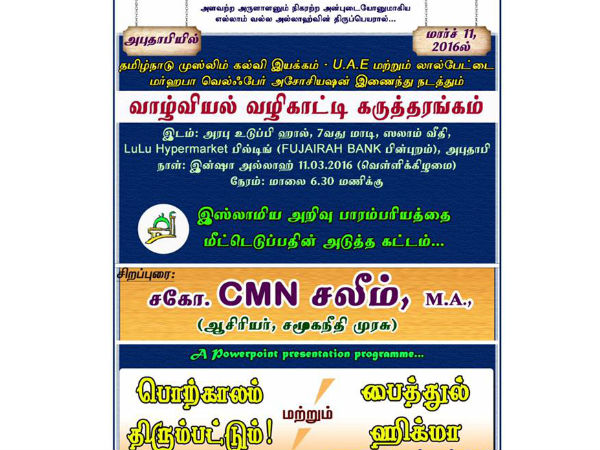 அபுதாபியில் தமிழ்நாடு முஸ்லிம் கல்வி இயக்கம், லால்பேட்டை மர்ஹபா வெல்பேர் அசோசியேஷன் ஆகியவை இணைந்து வாழ்வியல் வழிகாட்டி கருத்தரங்கத்தை 11.03.2016 அன்று மாலை 6.30 மணிக்கு நடத்துகிறது.
