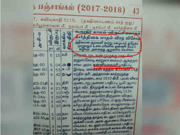 2017ஆம் ஆண்டு பஞ்சாங்கத்திலும் மழை, புயல், வெள்ளம் பற்றி கணித்துள்ளது. இதில் பல சம்பவங்கள் பலித்துள்ளன. ஓகி புயல் தென்மாவட்டங்களை புரட்டிப் போட்டுள்ளது. கனமழை, சூறாவளிக் காற்றால் கன்னியாகுமரி மாவட்டம் உருக்குலைந்துள்ளது. மீனவர்கள், விவசாயிகளின் வாழ்வாதாரம் கேள்விக்குறியாகியுள்ளது.
