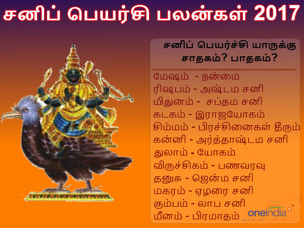 சனி பகவான் திருக்கணித பஞ்சாங்கப்படி வரும் 26.01.2017 அன்று வியாழக்கிழமை இரவு 07.31 மணிக்கு விருச்சிக இராசியில் இருந்து தனுசு இராசிக்கு பெயர்ச்சியாகிறார்.