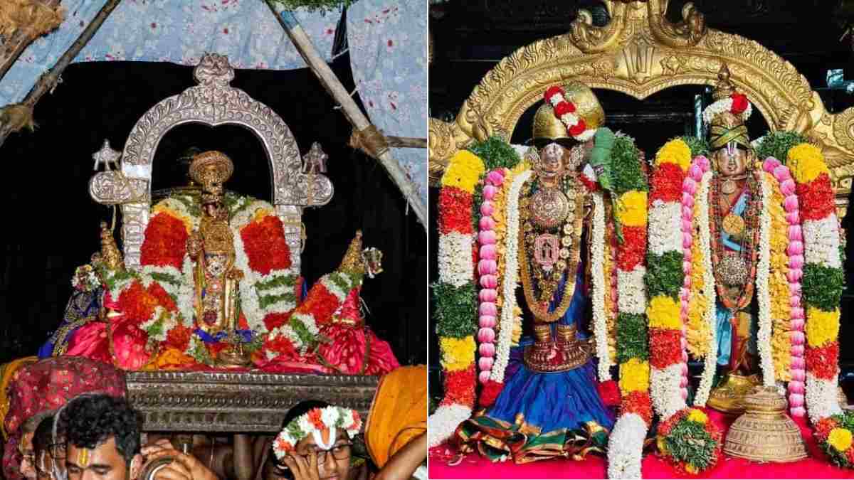 ஸ்ரீரங்கநாதர் பிறந்த தினத்தன்று ஸ்ரீரங்கத்தில் தேரோட்டம் நடைபெறும். இந்த ஆண்டு நாளைய தினம் தேரோட்டம் நடைபெறுகிறது. இதனை முன்னிட்டு ஆண்டாளும், ரங்கமன்னாரும் சர்வ அலங்காரத்தில் காட்சி அளித்தனர். அதை தொடர்ந்து ஆண்டாளுக்கு பட்டு வஸ்திரம் அனுவிக்கப்பட்டு சிறப்பு பூஜைகள் நடைபெற்றது. ஆண்டாள் சூடிக்கொடுத்த பட்டு வஸ்திரங்கள், மாலை, கிளி ஆகியவற்றை ரமேஷ் பட்டர் மாசி வீதியில் வழியாக மேள தாளங்கள் முழங்க கொண்டு வந்தார். இதையடுத்து அதனை தக்கார் ரவிச்சந்திரன். நிர்வாக அதிகாரி முத்துராஜா ஆகியோர் ஸ்ரீரங்கம் கொண்டு சென்றனர்.