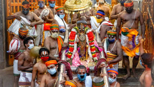 திருச்சி: ஸ்ரீரங்கம் ரங்கநாதர் கோவிலில் ஆண்டுதோறும் நம்பெருமாள் ஊஞ்சல் உற்சவம் 9 நாட்கள் கொண்டாடப்படுகிறது. இந்தாண்டு ஊஞ்சல் உற்சவம் 3ஆம் தேதி தொடங்கியது. இந்த உற்சவம் வருகிற 11ஆம் தேதி வரை நடைபெறுகிறது. இதையொட்டி நம்பெருமாள் உபநாச்சியார்களுடன் நாலுகால் மண்டபத்தில் திருவந்திக்காப்பு கண்டருளினார்.