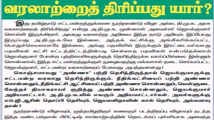 'இது தமிழ்நாடு சட்டமன்றத்துக்கான நூற்றாண்டு விழா அல்ல, தி.மு.க. அரசுவரலாற்றைத் திரிக்கிறது' என்று அ.தி.மு.க. முன்னாள் அமைச்சர் ஜெயக்குமார்சொல்லி இருக்கிறார். அவரது வரலாற்று அறிவை இந்த நாடு அறியும். இப்போது இருப்பது அ.தி.மு.க.வே இல்லை, அந்தக் கட்சிக்கு அங்கீகரிக்கப்பட்ட பொதுச்செயலாளரே இல்லை, அங்கு பதவியில் இருக்கும் இரட்டையர்களது பதவிகள் கட்சி சட்டத் திட்டத்தின் படி செல்லாத பதவிகள் என்பதெல்லாம் ஜெயக்குமார் போன்ற புத்திசாலிகளுக்குத் தெரிந்திருக்க வாய்ப்பில்லை.