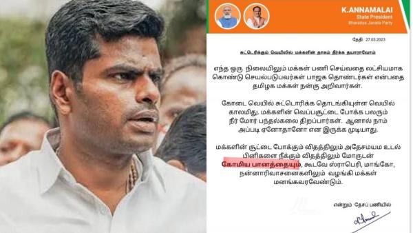 இதற்கிடையே இணையத்தில் பாஜக மாநில தலைவர் அண்ணாமலை எழுதியதாக ஒரு கடிதம் உலா வந்து கொண்டிருக்கிறது. அதில் பிரதமர் மோடி, பாஜக தேசிய தலைவர் நட்டா ஆகியோரின் படங்கள் இடம் பெற்றுள்ளது. மேலும், பாஜக மாநில தலைவர் அண்ணாமலையின் லெட்டர் பேட் போன்றும் அது இருக்கிறது. இணையத்தில் பரவும் அந்த கடிதத்தில், "சுட்டெரிக்கும் வெயிலில் மக்களின் தாகம் தீர்க்க தயாராவோம். எந்த ஒரு நிலையிலும் மக்கள் பணி செய்வதை லட்சியமாகக் கொண்டு செயல்படுபவர்கள் பாஜக தொண்டர்கள் என்பதைத் தமிழக மக்கள் நன்கு அறிவார்கள்.