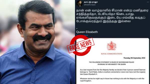 சீமான் பற்றி ராணி எலிசபெத் வெளியிட்டதாக கூறப்படும் இந்த அறிக்கை பொய்யானது ஆகும். இந்த அறிக்கை உண்மையில் வெளியிடப்படவில்லை.