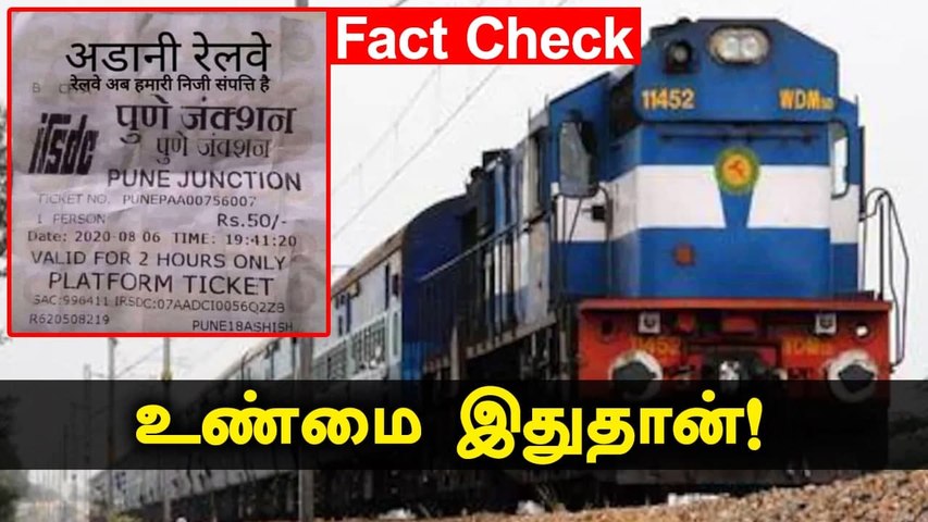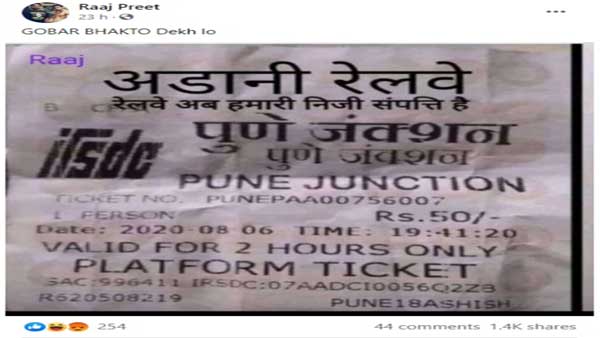புனே ரயில் நிலையத்தில் ப்ளாட்பார்ம் டிக்கெட் ரூ50 என அச்சிடப்பட்ட ஒரு படம் சமூக வலைதளங்களில் ஷேர் செய்யப்பட்டு வருகிறது. அதானி குழுமத்துக்கு ரயில்வே துறை விற்பனை செய்யப்பட்டதால்தான் ரூ 5க்கு விற்பனை செய்யப்பட்ட டிக்கெட் இப்போது ரூ50க்கு விற்கப்படுகிறது என்பது ஷேரிங் செய்திகளின் சாராம்சம்.