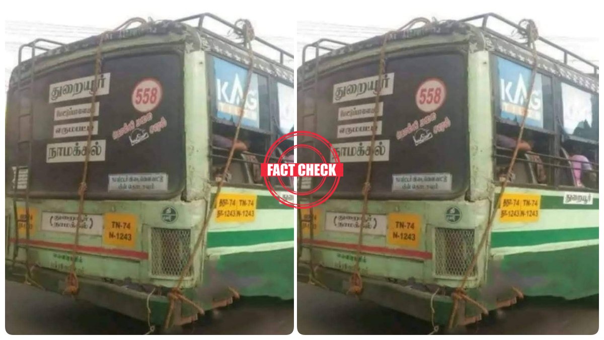 இதற்கிடையே இந்தப் படம் உண்மை தானா.. இது எங்கே எடுக்கப்பட்ட படம் என்பது குறித்து நாம் ஆய்வு செய்தோம். அதில் இப்போது இணையத்தில் பரவும் படத்தின் நிறம், அதன் பேருந்து எண், ஊர் ஆகியவற்றை வைத்து அது தமிழ்நாட்டைச் சேர்ந்த பேருந்து தான் என்பது உறுதியாகிறது. நாமக்கல் மற்றும் துறையூர் இடையே இயக்கப்படும் பேருந்து என்பதும் உறுதியாகிறது.
