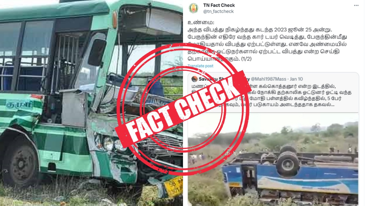 இதுகுறித்து TN Check எக்ஸ் வலைதளத்தில் கூறியிருப்பதாவது: அந்த விபத்து நிகழ்ந்தது கடந்த 2023 ஜூன் 25 அன்று. பேருந்தின் எதிரே வந்த கார் டயர் வெடித்து, பேருந்தின் மீது மோதியதால் விபத்து ஏற்பட்டுள்ளது. எனவே அண்மையில் தற்காலிக ஓட்டுநர்களால் ஏற்பட்ட விபத்து என்ற செய்தி பொய்யானதாகும்.