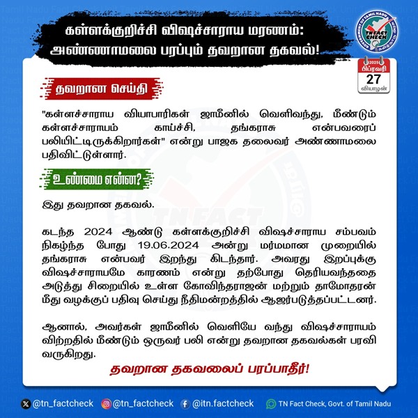 இந்நிலையில் தமிழக அரசின் உண்மை சரிபார்ப்பு குழு பாஜக மாநில தலைவர் அண்ணாமலையின் பதிவில் உள்ளது தவறான தகவல் என்று விளக்கம் அளித்துள்ளது. அந்த பதிவில், "கடந்த 2024ம் ஆண்டு கள்ளக்குறிச்சி விஷச்சாராய சம்பவம் நிகழ்ந்த போது 19.06.2024 அன்று மர்மமான முறையில் தங்காசு என்பவர் இறந்து கிடந்தார். அவரது இறப்புக்கு விஷச்சாராயமே காரணம் என்று தற்போது தெரியவந்ததை அடுத்து சிறையில் உள்ள கோவிந்தராஜன் மற்றும் தாமோதரன் மீது வழக்குப் பதிவு செய்து நீதிமன்றத்தில் ஆஜர்படுத்தப்பட்டனர். ஆனால் அவர்கள் ஜாமீனில் வெளியே வந்து விஷச்சாராயம் விற்றதில் மீண்டும் ஒருவர் பலி என்று தவறான தகவல்கள் பரவி வருகிறது" என்று கூறியுள்ளது.