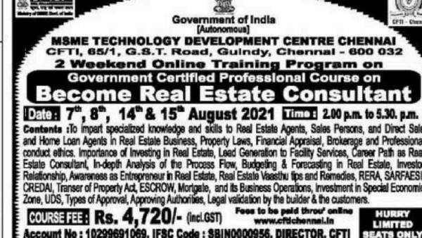 மத்திய அரசின் சிறு, குறு மற்றும் நடுத்தர தொழில் வளர்ச்சி நிறுவனமானது ரியல் எஸ்டேட் ஆலோசகர் என்ற சான்றிதழ் பயிற்சியை ஆகஸ்ட் 7-ந் தேதி முதல் நடத்துகிறது,