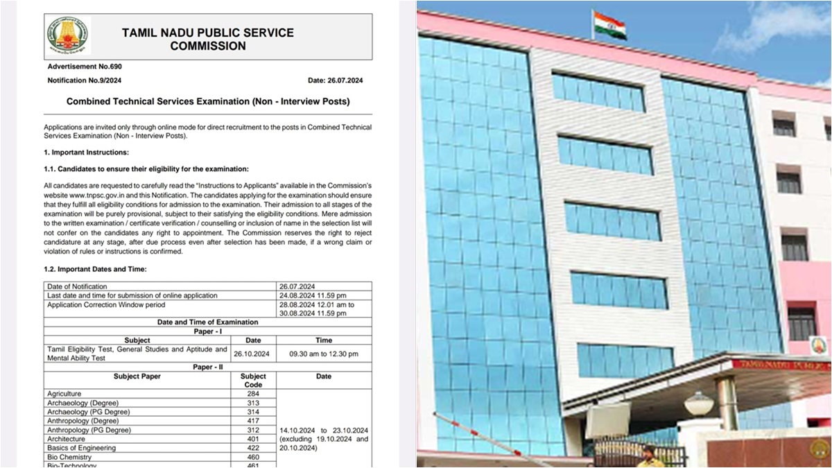 தமிழ்நாடு அரசு பணியாளர் தேர்வாணையமான டிஎன்பிஎஸ்சி, உதவிப் பொறியாளர், புவியியலாளர் , வேதியியலாளர், உள்ளிட்ட பணியிடங்கள் அடங்கிய ஒருங்கிணைந்த தொழில்நுட்ப சேவைகள் தேர்வுக்கு தகுதியானவர்கள் ஜூலை 26ம் தேதி (இன்று) முதல் விண்ணப்பிக்க அழைப்பு விடுத்துள்ளது.