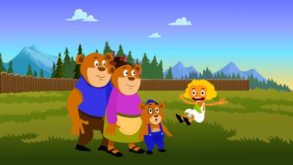 இதர்க்கிடையில் , வெளியே சென்ற கரடி குடும்பம் வீட்டுக்கு திரும்பின. அவர்கள் வீட்டின் கதவு திறந்திருப்பதை கண்டு அதிரிச்சியாகின. யாரோ வீட்டில் இருக்கிறார்கள் என்பதையும் புரிந்துகொண்டான. அவர்களின் சாப்பாடு டேபிளில் எல்லாம் சிதறி கிடப்பதை பார்த்து அதிர்ந்தன. குட்டி கரடி, ' அப்பா என் சேரை யாரோ உடைச்சிட்டாங்க' னு அழ ஆரம்பிச்சுது. மூவரும் மெதுவாக பெட்ரூமிற்கு சென்றார்கள்.