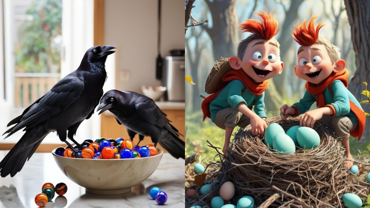 காகங்கள், ஜிம், ஜாக் வீட்டிற்குள் சுற்றி வந்தன. அவர்கள் கண்களுக்கு ஏதும் புலப்படவில்லை. அதே சமயம் அவர்கள் கொண்டு வந்த முட்டையை பார்த்த அம்மா, மீண்டும் நீங்கள் இப்படி செய்திருக்க கூடாது. அந்த குருவிகள் பாவம் என கோவப்பட்டு சென்றார். காகங்கள் விட்டபாடில்லை. மாடியின் ஜன்னல் வழியாக, உள்ளே சென்றது. ஒரு பௌலில் நல்ல மிருதுவான துணியால் சுற்றப்பட்ட கோலிக்காவை பார்த்ததும் இதோ முட்டைகள் என்றது ஒரு காகம். இல்லை இல்லை என்றது இன்னொரு காகம். அவர்கள் நன்றாக பொதிந்து வைத்துள்ளார்கள், இதுதான் என அந்த கோலிக்காவை தூக்கி சென்றது.