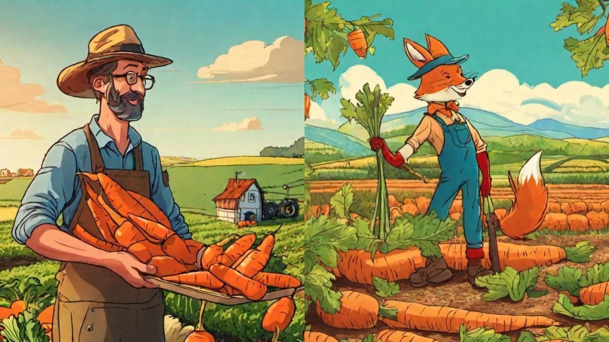 விவசாயி ஒரு நிமிடம் யோசித்தான், அது வந்து கேரட். இதன் வேர்களை நான் எடுத்து கொள்கிறேன். செழிப்பாக வளரும் இலைகளை நீ எடுத்து கொள் என்றான். நரி, வேர்களால் உனக்கு என்ன பயன், என்றது. விவசாயி அதை மலை அடிவாரத்தில் வாழ்வபர்கள் வாங்குவார்கள் என்றான். அது சரி, ஏன் வெட்டி கதை, உன்னை எப்படி நம்புவது என்றது. விவசாயி டக்கென வானத்தில் இருந்த நிலாவை காண்பித்து நிலா சாட்சியாக என்றான். நரியும் நம்புகிறேன் என்று சென்றது.