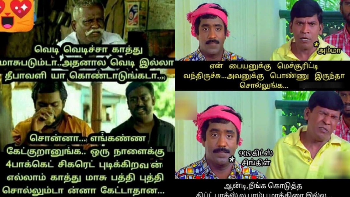 சென்னை : தீபாவளி ஸ்பெஷலாக வீட்டு வாசலில் பட்டாசுகள் வெடித்த கையோடு, சமூகவலைதளப் பக்கங்களிலும் மீம்ஸ் சரவெடிகளைக் கொளுத்திப் போட்டு வருகின்றனர் நம் நெட்டிசன்கள்.