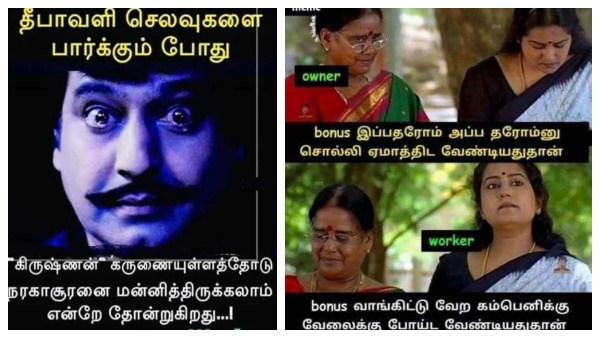 தீபாவளிக்கு பல செலவுகள்..கூடவே புது பாத்திரங்கள் வாங்க வேண்டும் என்று புது செலவை இல்லத்தரசி இழுத்து வைப்பார். புது டிரஸ், பட்டாசு மட்டுமல்லாது பலகாரங்களையும் பார்த்து பார்த்து வாங்க வேண்டும். இப்படி செலவுகள் வருவதைப் பார்த்தால் பேசாமல் கிருஷ்ண பரமாத்மா நரகாசூரனை வதம் செய்யாமல் மன்னிச்சு விட்டிருக்கலாமோ என்று சொல்கின்றனர் இந்த மீம்ஸ் பதிவாளர்கள்.