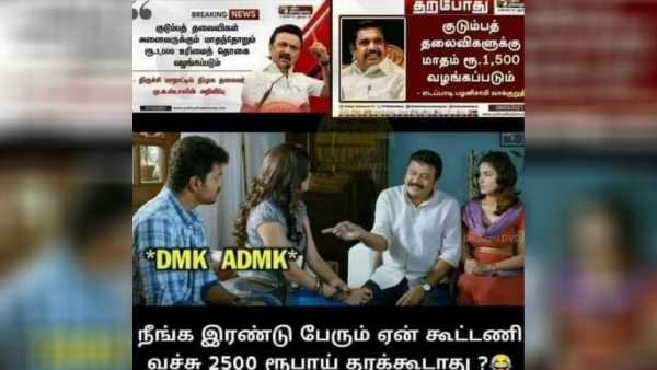 இப்படி மாறி மாறி இரு கட்சிகளும் குடும்பத் தலைவிகளுக்கு நிதி வழங்குவதாக அறிவித்துள்ள நிலையில்தான் பல மீம்ஸ்கள் சமூக வலைதளங்களில் வைரலாக பரவி வருகின்றன. அதில் ஒரு மீம்ஸ், எல்லா வாட்ஸ்அப் குரூப்களிலும் தவறாமல் இடம் பிடித்துள்ளது.