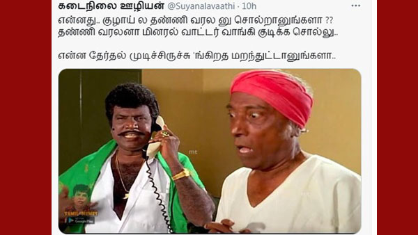 இன்னொருவர் தனது ட்விட்டரில், தேர்தல் முடிந்த பின் அரசியல்வாதியிடம் பேசுவது போல் போட்டிடுகிறார். போனில் பேசும் அரசியல்வாதி குழாயில் தண்ணீர் வரலைன்னு சொல்றாங்களா? குழாயில தண்ணி வரலைன்னா.. மினரல் வாட்டர் வாங்கி குடிக்க சொல்லு. எலக்சென் முடிஞ்சிருச்சு மறந்திருச்சா? என்பதாக மீம்ஸ் உள்ளது.