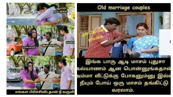 ஆடி மாதம் பிறந்து விட்டால், புதுமணத் தம்பதிகளைப் பிரித்து வைத்து விடும் வழக்கம் நம் மாநிலத்தில் உள்ளது. இதை நினைத்து புதுமணத் தம்பதிகள் வருத்தத்தில் இருக்கிறார்கள் என ஆண்டுதோறும் ஆடி மாதத்தில் மீம்ஸ்கள் இணையத்தில் அதிகம் பகிரப்படும். ஆனால் இம்முறை சற்று வித்தியாசமாக புதுமணத் தம்பதிகளுக்கு போட்டியாக திருமணமாகி ஓராண்டுக்கு மேலாகிய பழைய தம்பதிகளையும் சேர்த்துக் கலாய்த்துள்ளனர்.