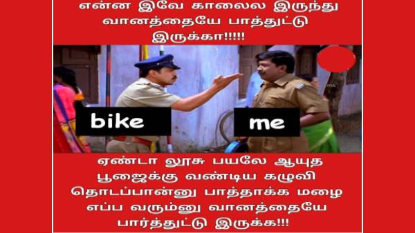 ஆயுதபூஜையை ஒட்டி வாகனங்களை கழுவி பூஜை செய்பவர்களை வைத்து விதவிதமான மீம்ஸ்கள் பகிரப்பட்டு வருகின்றன.