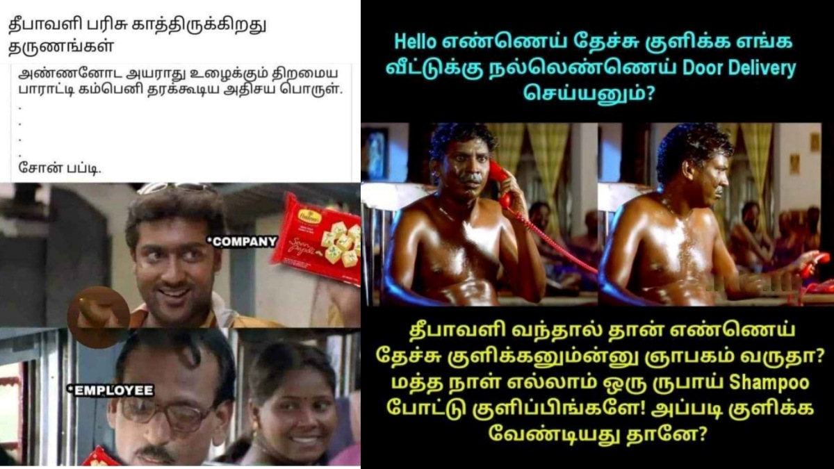 இதோ அப்படியாக நம் கண்ணில் பட்ட நகைச்சுவையான சில தீபாவளி ஸ்பெஷல் மீம்ஸ்களின் தொகுப்பு உங்களுக்காக...