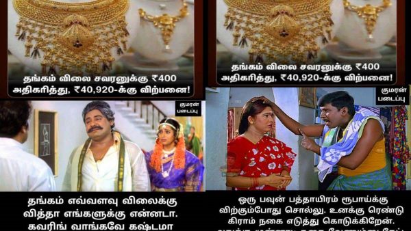 தங்கம் விலை உயர்வு பற்றிய மீம்ஸ்கள் இணையத்தில் அதிகம் பகிரப்பட்டு வருகின்றன.