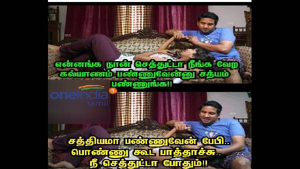 இன்னுமா இந்த உலகம் சத்தியம் செய்வதையெல்லாம் நம்பிக் கொண்டிருக்கிறது என காதலர்களை கிண்டலடித்து மீம்ஸ்களைப் பகிர்ந்து வருகின்றனர். இதில் பல மீம்ஸ்கள் ரொம்பவே பிராக்டிகல் ரகம். காதலர்கள் மட்டும்தான் சத்தியம் செய்ய வேண்டுமா என திருமணமான தம்பதிகள் எப்படி காதல் சத்தியம் செய்வார்கள் என்றும் மறக்காமல் மீம்ஸ்களை பகிர்ந்து வருகின்றனர்.