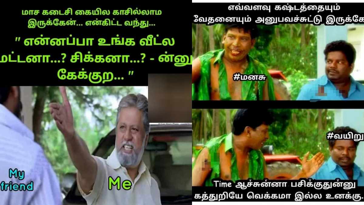 அதில், இந்த வாரம் ஏப்ரல் மாதத்தின் கடைசி ஞாயிறு என்பதால், கையில் காசில்லாமல் கறி எடுக்க முடியவில்லை என்றும் மீம்ஸ் போட்டு புலம்பியுள்ளனர். அதுதவிர, ஞாயிறு ஒருநாள் வீட்டில் இருக்கலாம் என்றால், அன்றைக்கு ரேஷனுக்குப் போக வேண்டும், கல்யாணத்திற்குப் போக வேண்டும் என ஆயிரத்தெட்டு வேலைகள் இருக்கிறதே என்பது மாதிரியான மீம்ஸ்கள் ரசிக்கும்படி உள்ளன.