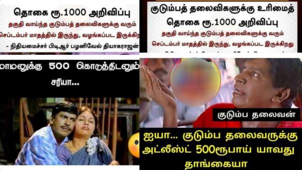 குடும்பத்தலைவிகளுக்கு மாதம் ரூ. 1000 வழங்கும் திட்டத்தை வைத்து நகைச்சுவையான மீம்ஸ்களைப் பகிர்ந்து வருகின்றனர் நெட்டிசன்கள்.