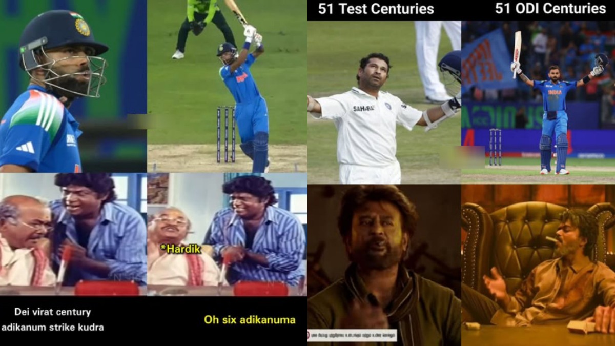 பேட்ட படத்தில் ரஜினிகாந்த் ஸ்டைலாக சிகரெட் வைத்து தம் அடிப்பதை போல், லியோ படத்தின் க்ளைமாக்ஸ் காட்சியில் விஜய்-ம் ஸ்டைலாக அமர்ந்து சிகரெட் பிடிப்பார். இதில் வரும் ரஜினியை சச்சின் டெண்டுல்கராகவும், விஜயை விராட் கோலியாகவும் மாற்றி உருவாக்கப்பட்டுள்ள மீம் மரணம் மாஸ் ரகம்.