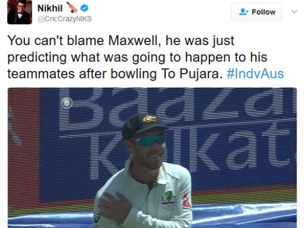 விராட் கோஹ்லி கையில் காயம் ஏற்பட்டதை மேக்ஸ்வெல் கேலி செய்ததாக நினைக்க வேண்டாம், அவர் தனது அணி பந்து வீச்சாளர்கள், புஜாராவுக்கு பந்து வீசி கை பழுக்க போவதைதான் சிம்பாலிக்காக கூறியுள்ளார் என கலாய்க்கிறது இந்த டிவிட்.