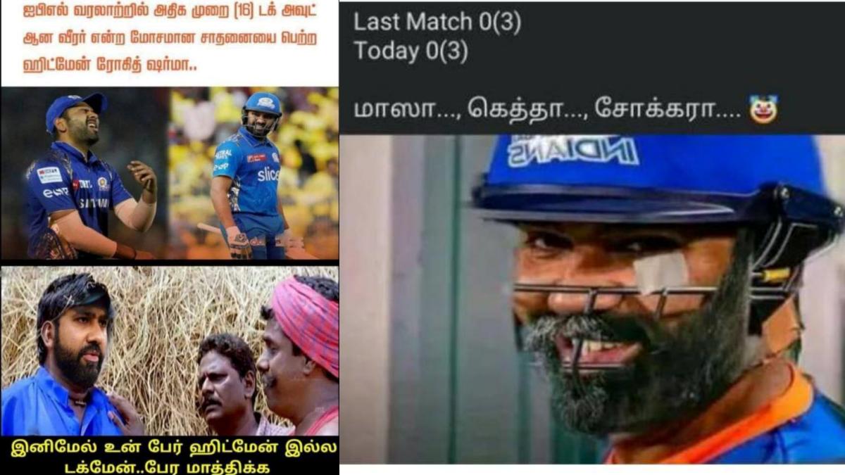 சென்னை: ஐபிஎல் போட்டிகளில் அடுத்தடுத்து டக் அவுட்டாகி வரும் ரோகித் சர்மாவை கலாய்த்து நகைச்சுவையான மீம்ஸ்களைப் பகிர்ந்து வருகின்றனர் நெட்டிசன்கள்.