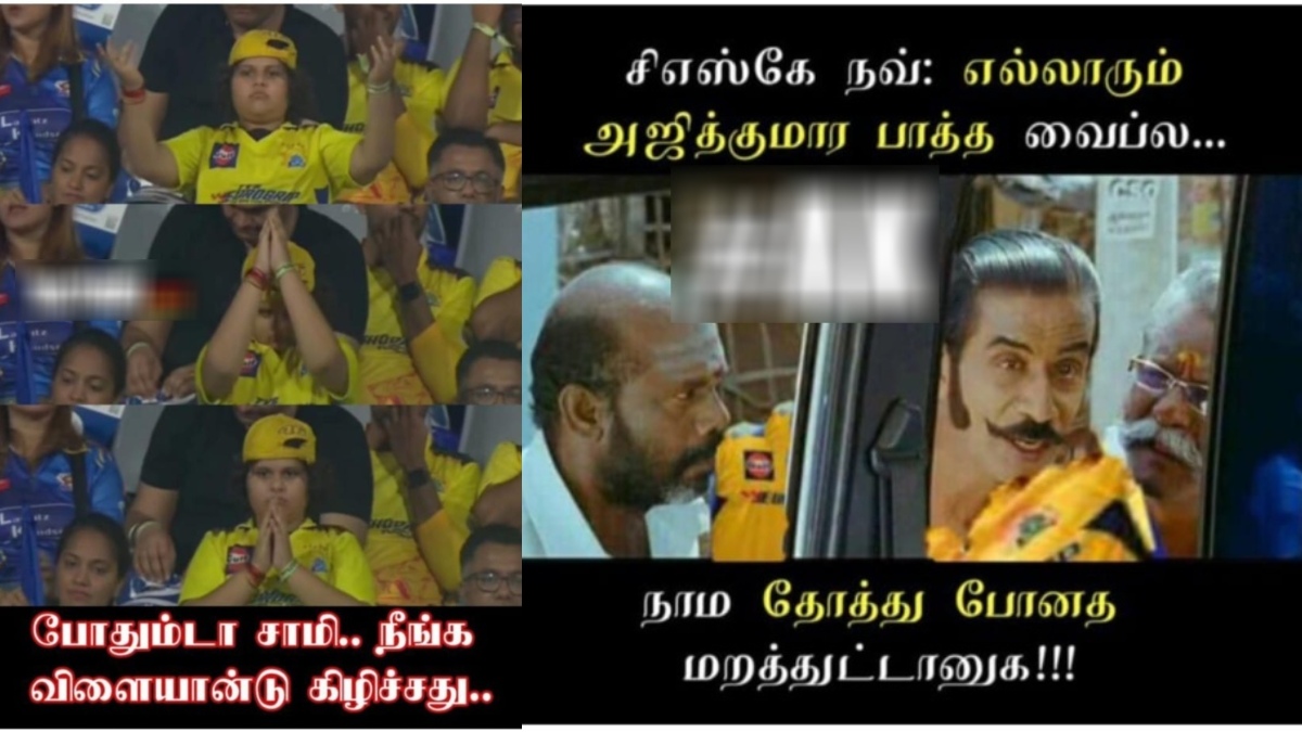 கடந்த வெள்ளியன்று நடந்த போட்டியை நடிகர் அஜித் குடும்பத்துடன் நேரில் பார்க்க வந்திருந்தார். இதனால் அன்றைய தினம் சமூகவலைதளப் பக்கங்களில் அவரைப் பற்றிய வீடியோக்களும், புகைப்படங்களும் அதிகம் பகிரப்பட்டன. இந்த சந்தோசத்தில் இருந்த ரசிகர்கள், சிஎஸ்கே தோல்வியை கொஞ்சம் கண்டுகொள்ளாமல் விட்டு விட்டார்கள் போல. அதனால்தான் இரண்டு தினங்களுக்குப் பிறகு இன்று சிஎஸ்கேவை மீம்ஸ்களில் வறுத்தெடுத்து வருகின்றனர்.