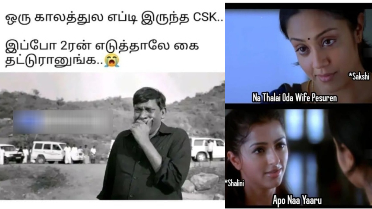 "ஒரு காலத்துல எப்டி இருந்த சிஎஸ்கே.. இப்போ ரெண்டு ரன்னு எடுத்தாலே கை தட்றானுங்களே" என்றும், "எங்களுக்கு 6வது கப்பெல்லாம் வேணாம்.. நாங்க இப்டியே ரிடையர் ஆகிடுறோம்.. ப்ளீஸ் விட்ருங்க!" என்றும் மீம்ஸ்களில் தங்கள் ஆதங்கங்களை வெளிப்படுத்தி வருகின்றனர்.