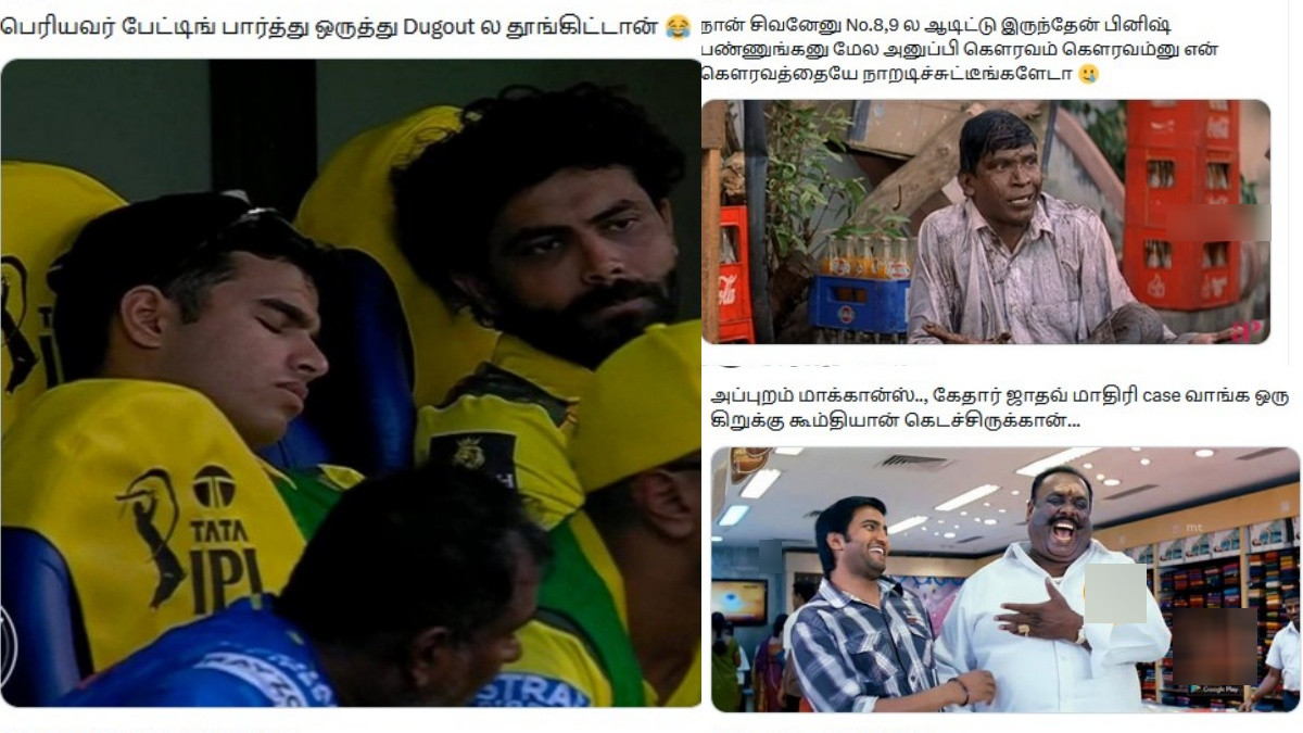 நேற்று சிஎஸ்கே அணியின் பேட்டிங், பவுலிங், பீல்டிங் என்று எல்லாமே மிக மோசமாக இருக்காது. முக்கியமாக சிஎஸ்கே அணியில் டாப் ஆர்டர் பேட்ஸ்மேன்கள் ரச்சின் ரவீந்திரா, தேவன் கான்வே, ருத்துராஜ், துபே என்று டாப் ஆர்டர் மொத்தமாக சரிந்தது. மிடில் ஆர்டர் ஜடேஜாவும் மோசமாக சொதப்பினார். பவுலிங்கில் பதிரானா, நூர் தவிர மற்ற எல்லோரும் மிக மோசமாக சொதப்பினர். இதை வைத்து நெட்டிசன்கள் பலரும் மீம்ஸ் போட்டு வருகின்றனர்.