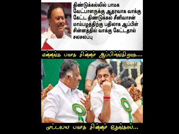 நிறைய மீம்ஸ்கள் சாட்சாத் திண்டுக்கல்லாருக்குதான்! எந்த பழம் பாமகவுக்கு என்று கூட தெரியாமல் ராமதாஸை மேடையிலேயே வைத்து கொண்டு உளறியதுதான். இதற்கான மீம்ஸில், "என்னங்க பாமக சின்னம் ஆப்பிள்ங்கிறாரு.." என்று ஓபிஎஸ் கேட்க, "முட்டாபய பாமக சின்னம் தேங்காய்.." என்று பதிலளிக்கிறார் முதல்வர் பழனிசாமி!