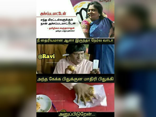 இந்நிலையில் கொலை மிரட்டல் குறித்தும் தமிழிசையின் பதிலை வைத்தும் நெட்டிசன்கள் ஏராளமான மீம்ஸ்களை வெளியிட்டுள்ளனர். அவற்றில் சில உங்கள் பார்வைக்கு..