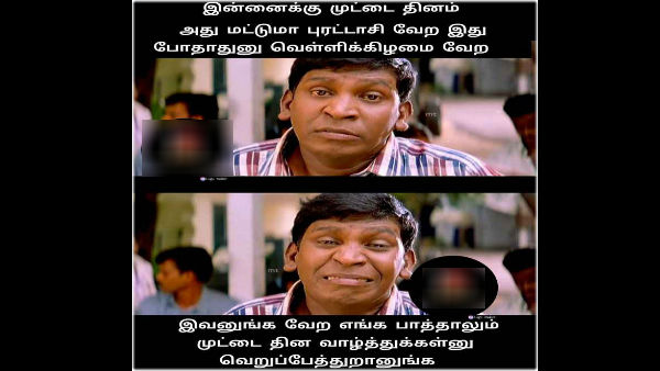 வழக்கம் போலவே முட்டை தினத்தையும் விதவிதமாக மீம்ஸ் போட்டு கொண்டாடி வருகிறார்கள் நெட்டிசன்கள். புரட்டாசி மாதம், வெள்ளிக்கிழமை என்பதால் பல வீடுகளில் இன்று முட்டை என்ற பெயரை உச்சரிக்கக்கூட மாட்டார்கள்.