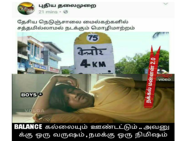 தமிழகத்தில் உள்ள மைல்கல்களில் ஹிந்தியில் பெயர் எழுதப்படுவதை கண்டித்து நெட்டிசன்கள் மீம்ஸ் வெளியிட்டு வருகின்றனர்.