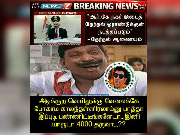 ஆர்கே நகர் மக்களுக்கு கொண்டாட்டம்... இன்னும் ஒரு முறை 4000 ரூபாய் கிடைக்கப் போகுது என்கிறது இந்த மீம்...
