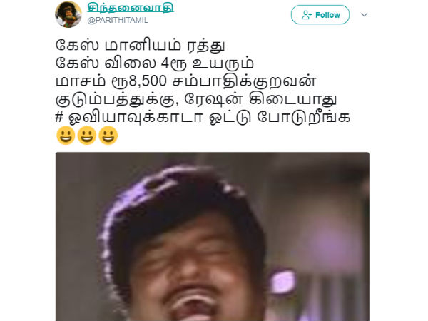 பிக்பாக்ஸ் நிகழ்ச்சியில் ஓவியாவை காப்பாத்த இளைஞர்கள் ஓட்டு போட்டதாக அந்த தொலைக்காட்சி அறிவித்தது. இந்நிலையில் ஓவியாவுக்கா ஓட்டு போடுறீங்க கேஸ் மானியம் ரத்து, கேஸ் விலை 4ரூ உயரும், மாசம் ரூ8,500 சம்பாதிக்குறவன் குடும்பத்துக்கு, ரேஷன் கிடையாது என்று நக்கலடித்துள்ளார் ஒரு நெட்டிசன்.