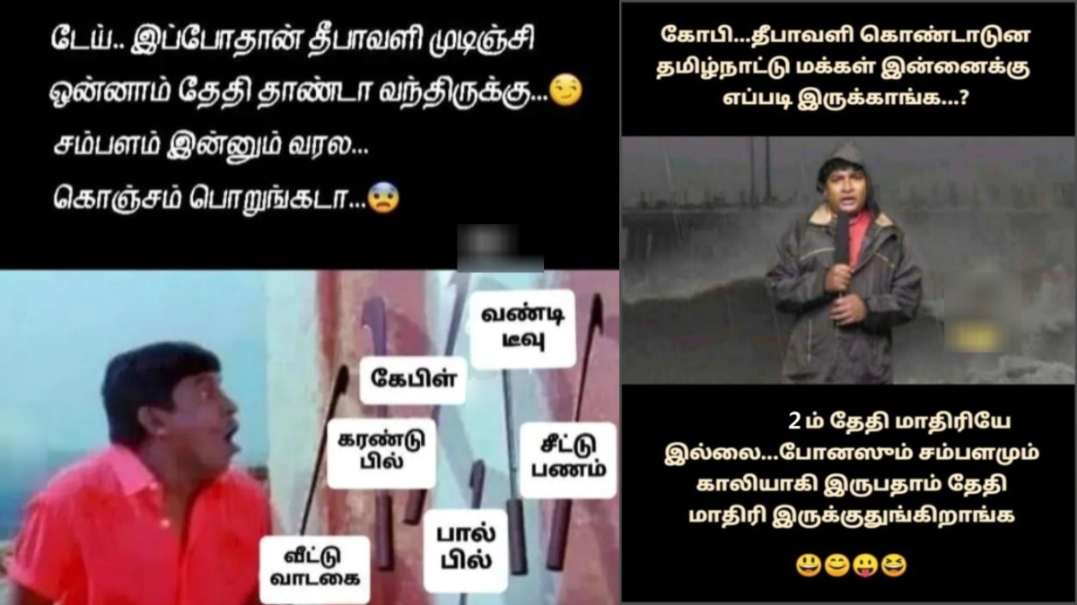 அதோடு தீபாவளி செலவுகள் ஒரு வழியாக முடிந்து விட்டது என பெருமூச்சு விடுவதற்குள், நவம்பர் மாதம் பிறந்து, அடுத்து இஎம்ஐ, வீட்டு வாடகை, இதர செலவுகள் என வரிசை கட்டத் தொடங்கி விட்டதே என்றும் மீம்ஸ்களில் புலம்பி வருகின்றனர்.