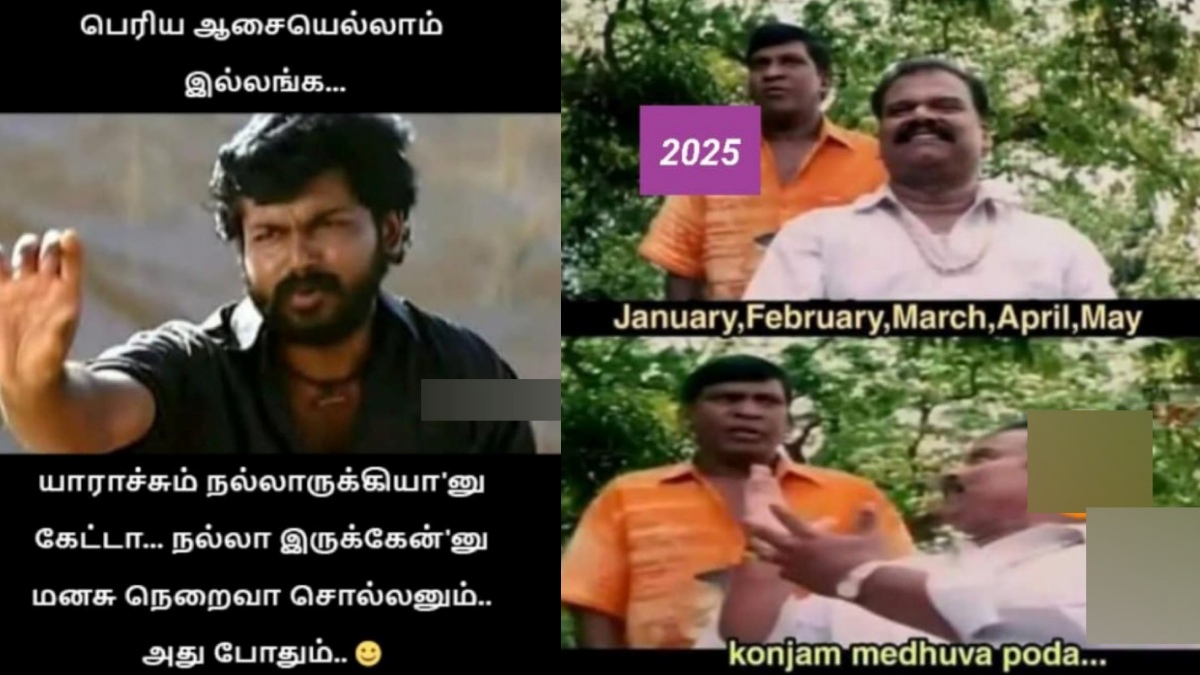 பிறகென்ன எக்ஸ்ட்ரா கமிட்மெண்ட்களைப் போலவே, எக்ஸ்ட்ரா புலம்பல்களும் மீம்ஸ்களில் அதிகமாக உள்ளன. "இருக்கிறதை வச்சுகிட்டு சந்தோசமா வாழணுமாம்.. இங்க இருக்கறது பூரா கடன்தான்.. பிறகெப்டி சந்தோசமா வாழுறது!" என்பதில் தொடங்கி, "பெரிய ஆசையெல்லாம் ஒண்ணும் இல்ல.. யாராவது நல்லா இருக்கியானு கேட்டா.. மனசார சூப்பரா இருக்கேன்னு சொல்லணும்.. அவ்ளோதான்" என யதார்த்தமான உண்மைகளை மீம்ஸ்களாக்கி இருப்பது ரசிக்கும்படி உள்ளன.
