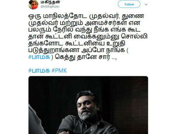 சென்னை: அதிமுக - பாமக கூட்டணியை என்னதான் ஒரு சிலர் கிண்டலடித்தாலும் அதையும் பாராட்டும் மனங்கள் டுவிட்டரில் இருக்கத்தான் செய்கின்றன.